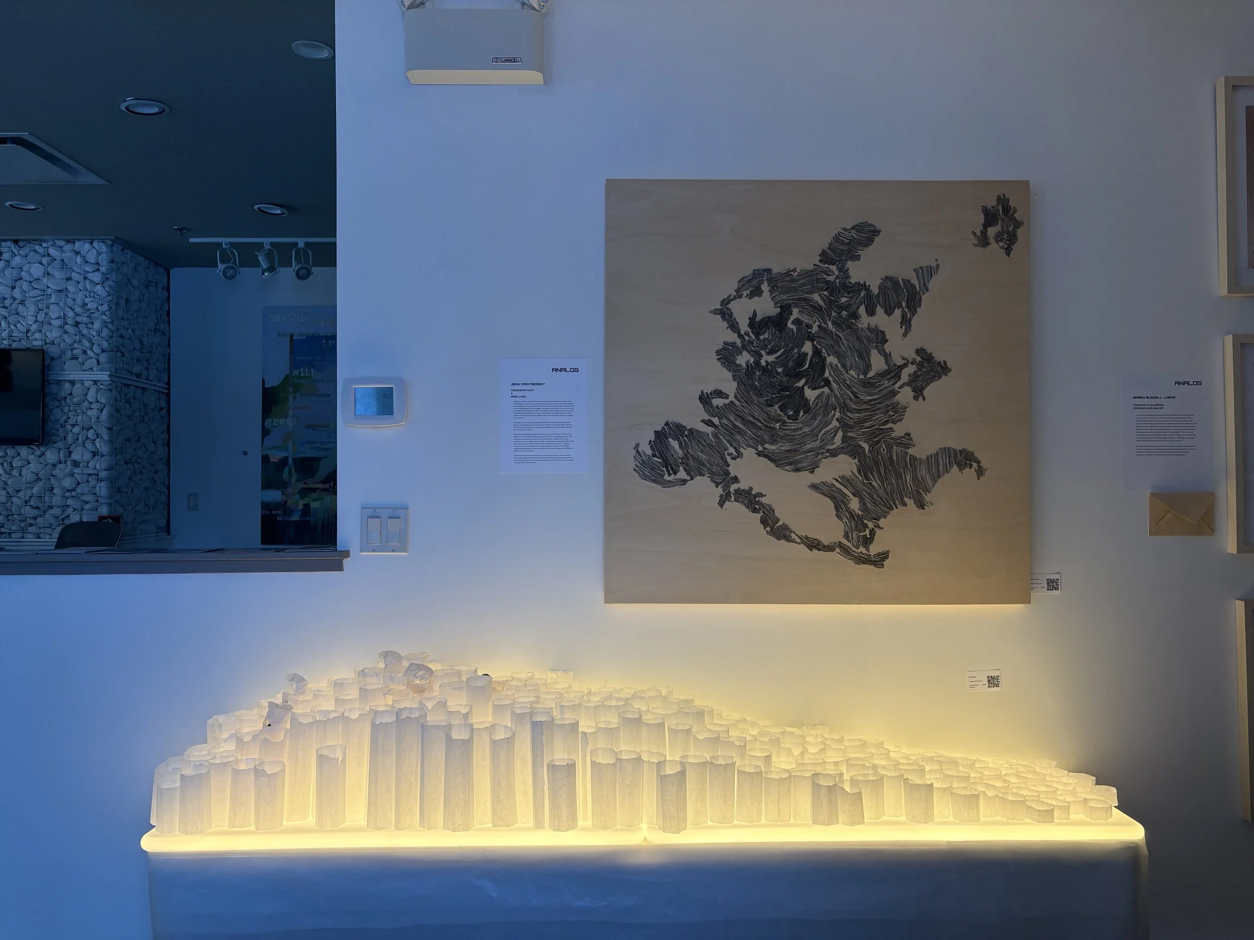 Homewrecker highlights the work of the outer layers of the nest—the layers that insulate and help maintain that steady environment for the developing larvae. The nest paper in this piece came from an already broken-up wasp nest I found. I wanted to use it in a project, give it new life. It takes wasps a really long time to build their nests, and I wanted to make this work as an ode to that labour. I added to the composition by drawing what the wasp paper looks like with sauce (chalk), capturing those different stripes of colour in their material based on the different types of wood they chewed.